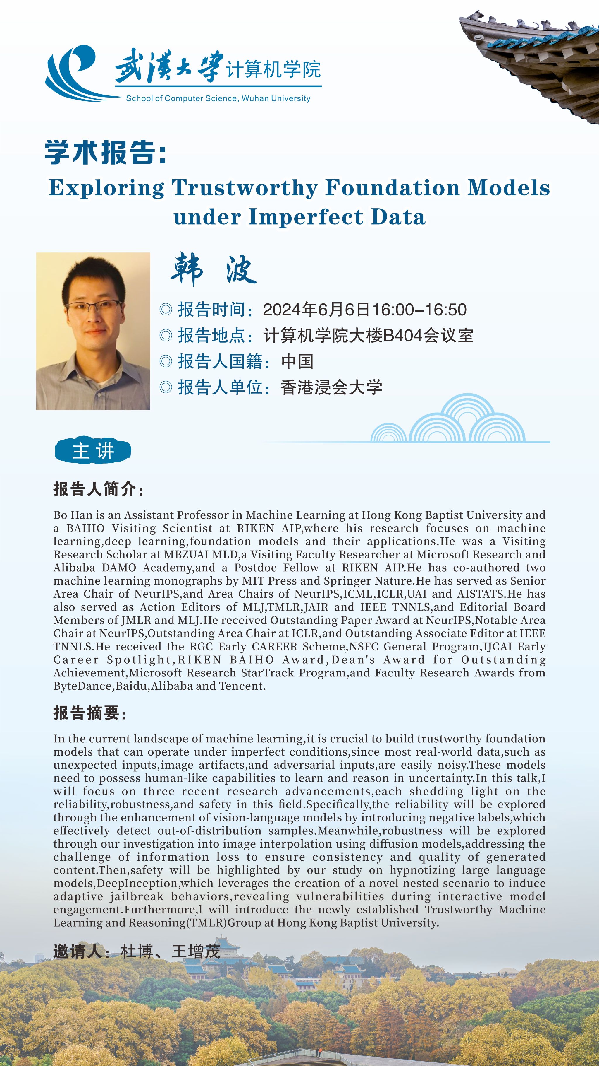 报告人简介:Bo Han is an Assistant Professor in Machine Learning at Hong Kong Baptist University and a BAIHO Visiting Scientist at RIKEN AIP, where his research focuses on machine learning, deep learning, foundation models and their applications. He was a Visiting Research Scholar at MBZUAI MLD, a Visiting Faculty Researcher at Microsoft Research and Alibaba DAMO Academy, and a Postdoc Fellow at RIKEN AIP. He has co-authored two machine learning monographs by MIT Press and Springer Nature. He has served as Senior Area Chair of NeurIPS, and Area Chairs of NeurIPS, ICML, ICLR, UAI and AISTATS. He has also served as Action Editors of MLJ, TMLR, JAIR and IEEE TNNLS, and Editorial Board Members of JMLR and MLJ. He received Outstanding Paper Award at NeurIPS, Notable Area Chair at NeurIPS, Outstanding Area Chair at ICLR, and Outstanding Associate Editor at IEEE TNNLS. He received the RGC Early CAREER Scheme, NSFC General Program, IJCAI Early Career Spotlight, RIKEN BAIHO Award, Dean's Award for Outstanding Achievement, Microsoft Research StarTrack Program, and Faculty Research Awards from ByteDance, Baidu, Alibaba and Tencent.