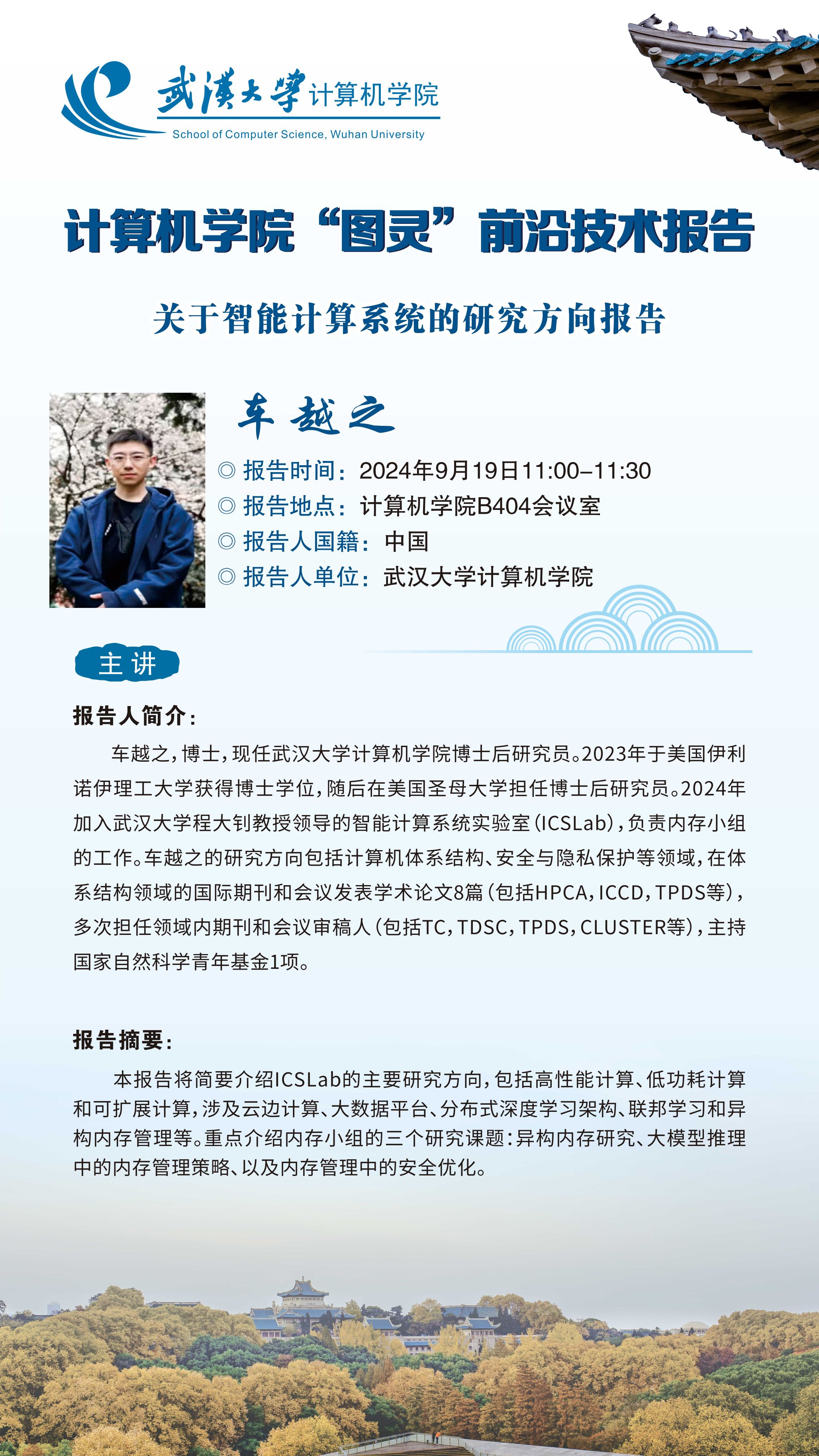 报告人简介:车越之,博士,现任世界杯体彩博士后研究员。2023年于美国伊利诺伊理工大学获得博士学位,随后在美国圣母大学担任博士后研究员。2024年加入武汉大学程大钊教授领导的智能计算系统实验室(ICSLab),负责内存小组的工作。车越之的研究方向包括计算机体系结构、安全与隐私保护等领域,在体系结构领域的国际期刊和会议发表学术论文8篇(包括HPCA,ICCD,TPDS等),多次担任领域内期刊和会议审稿人(包括TC,TDSC,TPDS,CLUSTER等),主持国家自然科学青年基金1项。