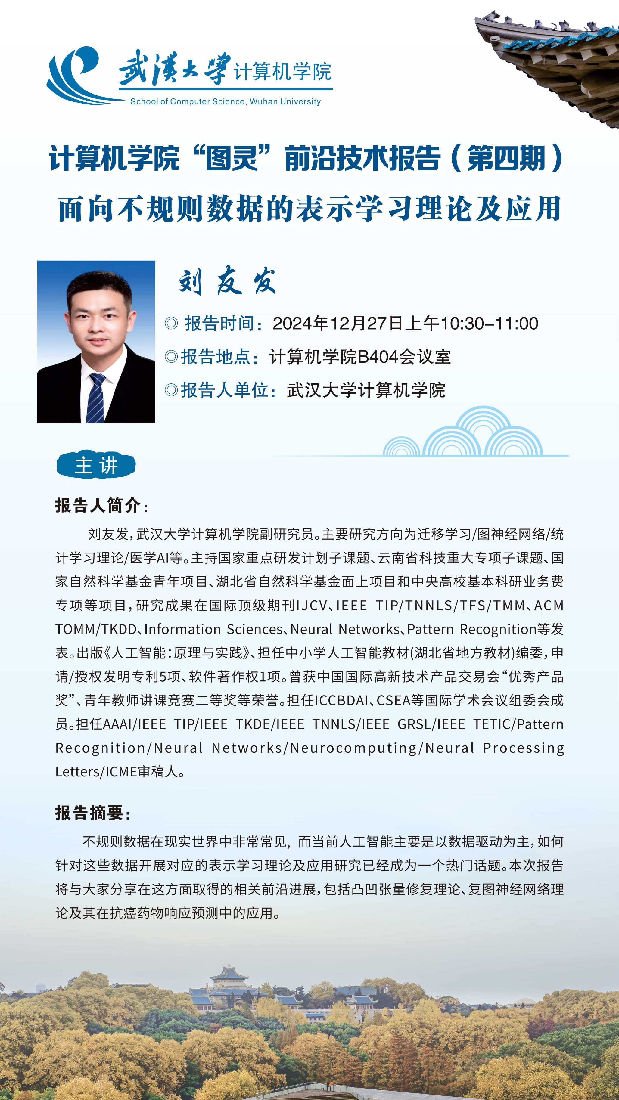 报告人简介:刘友发,世界杯体彩副研究员。主要研究方向为迁移学习/图神经网络/统计学习理论/医学AI等。主持国家重点研发计划子课题、云南省科技重大专项子课题、国家自然科学基金青年项目、湖北省自然科学基金面上项目和中央高校基本科研业务费专项等项目,研究成果在国际顶级期刊IJCV、IEEE TIP/TNNLS/TFS/TMM、ACM TOMM/TKDD、Information Sciences、Neural Networks、Pattern Recognition等发表。出版《人工智能:原理与实践》、担任中小学人工智能教材(湖北省地方教材)编委,申请/授权发明专利5项、软件著作权1项。曾获中国国际高新技术产品交易会“优秀产品奖”、青年教师讲课竞赛二等奖等荣誉。担任ICCBDAI、CSEA等国际学术会议组委会成员。担任AAAI/IEEE TIP/IEEE TKDE/IEEE TNNLS/IEEE GRSL/IEEE TETIC/Pattern Recognition/Neural Networks/Neurocomputing/Neural Processing Letters/ICME审稿人。