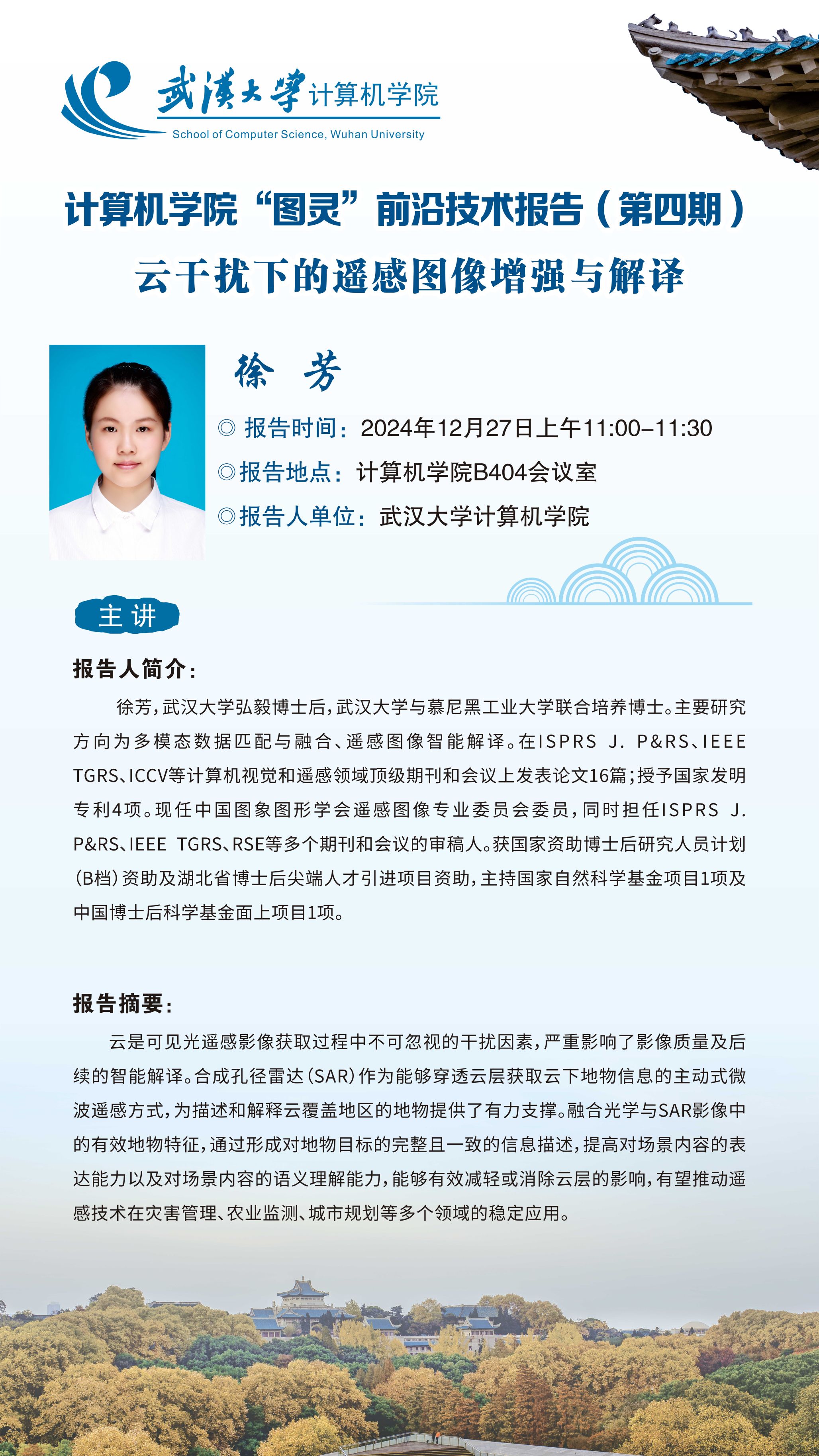 报告人简介:徐芳,武汉大学弘毅博士后,武汉大学与慕尼黑工业大学联合培养博士。主要研究方向为多模态数据匹配与融合、遥感图像智能解译。在ISPRS J. P&RS、IEEE TGRS、ICCV等计算机视觉和遥感领域顶级期刊和会议上发表论文16篇;授予国家发明专利4项。现任中国图象图形学会遥感图像专业委员会委员,同时担任ISPRS J. P&RS、IEEE TGRS、RSE等多个期刊和会议的审稿人。获国家资助博士后研究人员计划(B档)资助及湖北省博士后尖端人才引进项目资助,主持国家自然科学基金项目1项及中国博士后科学基金面上项目1项。