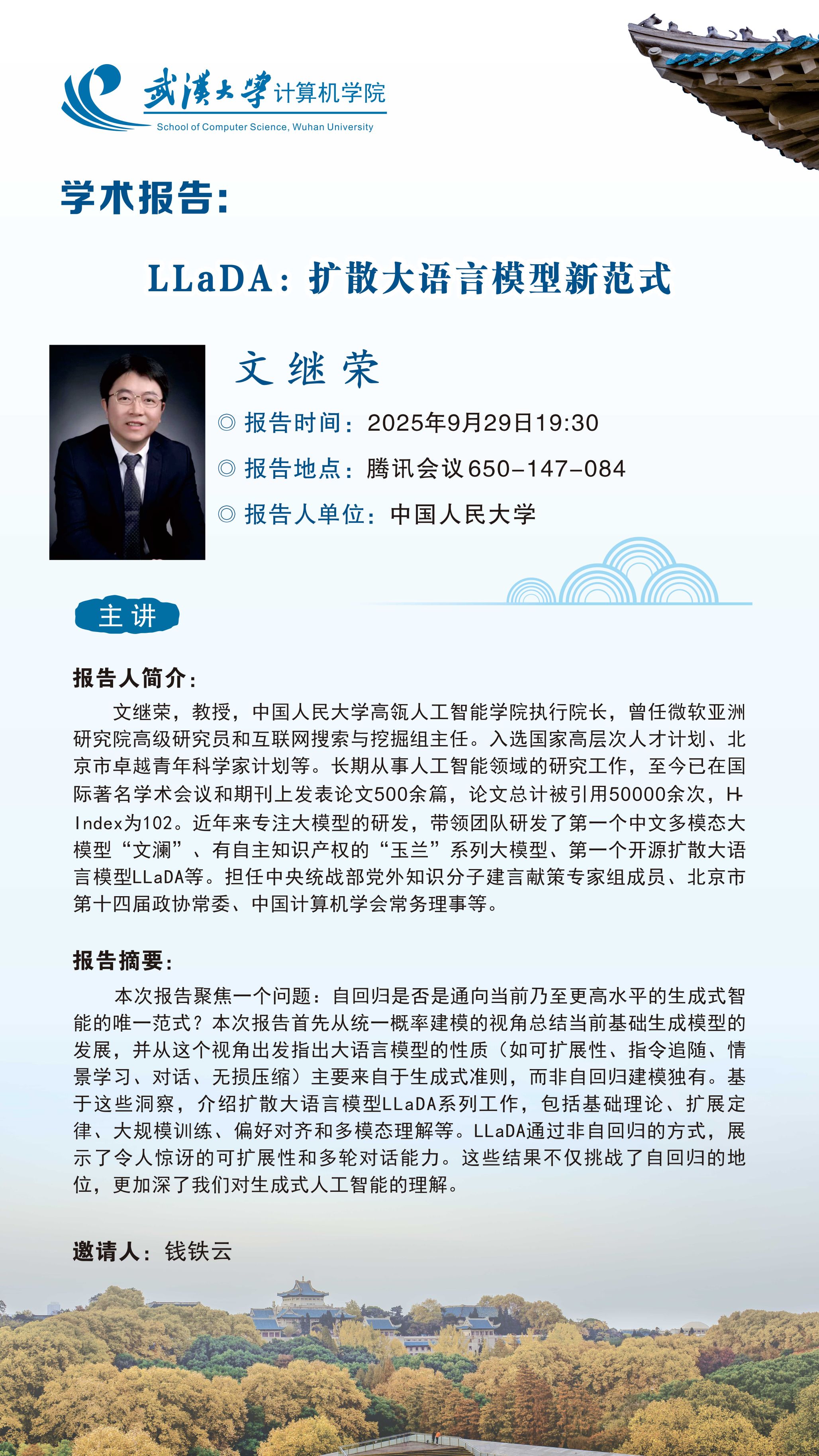 文继荣,教授,中国人民大学高瓴人工智能学院执行院长,曾任微软亚洲研究院高级研究员和互联网搜索与挖掘组主任。入选国家高层次人才计划、北京市卓越青年科学家计划等。长期从事人工智能领域的研究工作,至今已在国际著名学术会议和期刊上发表论文500余篇,论文总计被引用50000余次,H-Index为102。近年来专注大模型的研发,带领团队研发了第一个中文多模态大模型“文澜”、有自主知识产权的“玉兰”系列大模型、第一个开源扩散大语言模型LLaDA等。担任中央统战部党外知识分子建言献策专家组成员、北京市第十四届政协常委、中国计算机学会常务理事等
