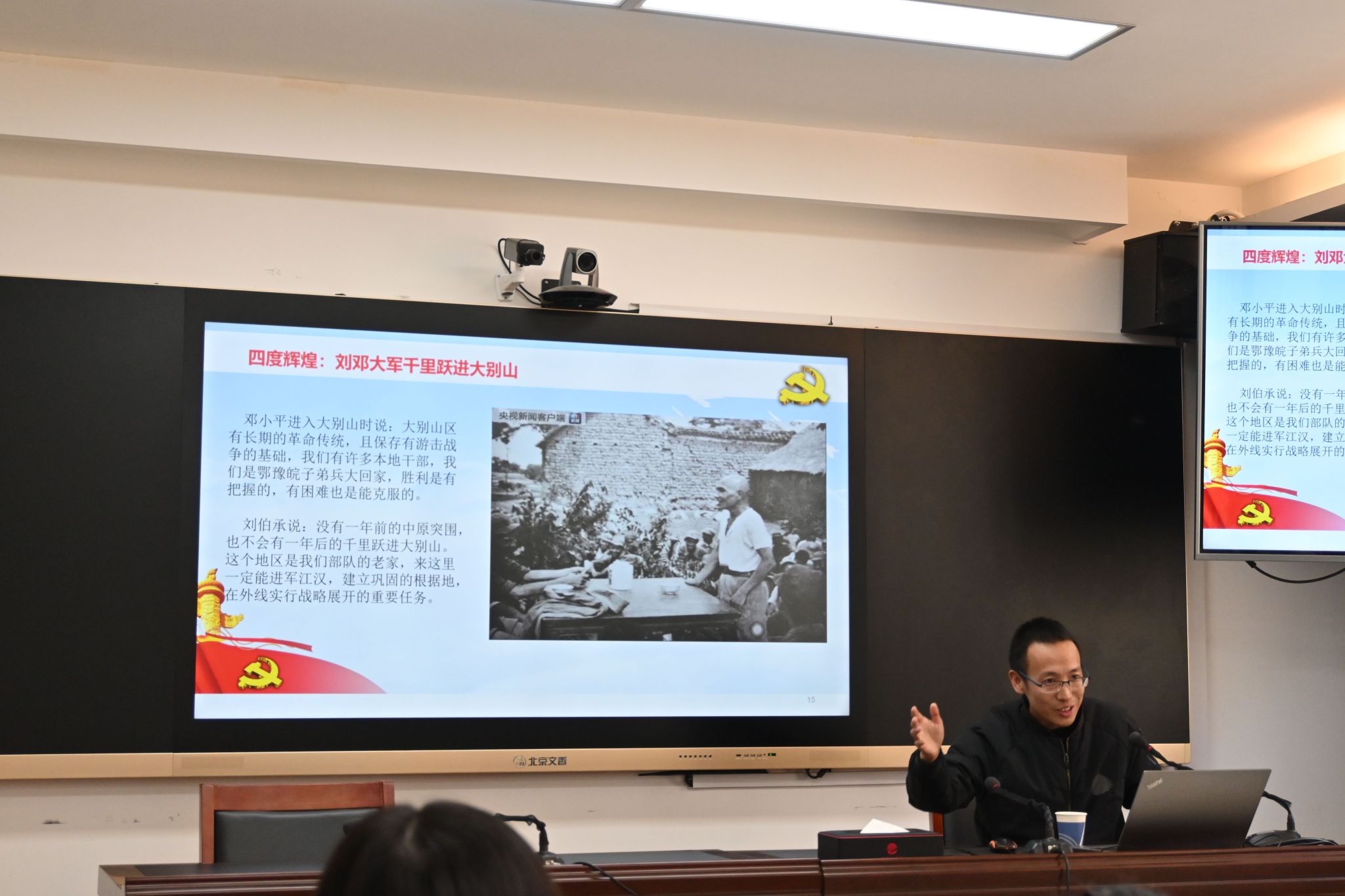 随后,在中共罗山县委党校熊新老师的党课上,全体党员骨干系统学习了“坚守信念、胸怀全局、团结一心、勇当前锋”的大别山革命精神。熊新老师就大别山精神的历史基础、传奇的红二十五军、大别山精神的内涵和传承等方面作了深入浅出的讲授,并激励与会党员继承先辈遗志,传承和弘扬好大别山精神,赓续红色基因,不忘初心、牢记使命,在全面建设社会主义现代化国家、实现中华民族伟大复兴的新征程上继续书写新的篇章。