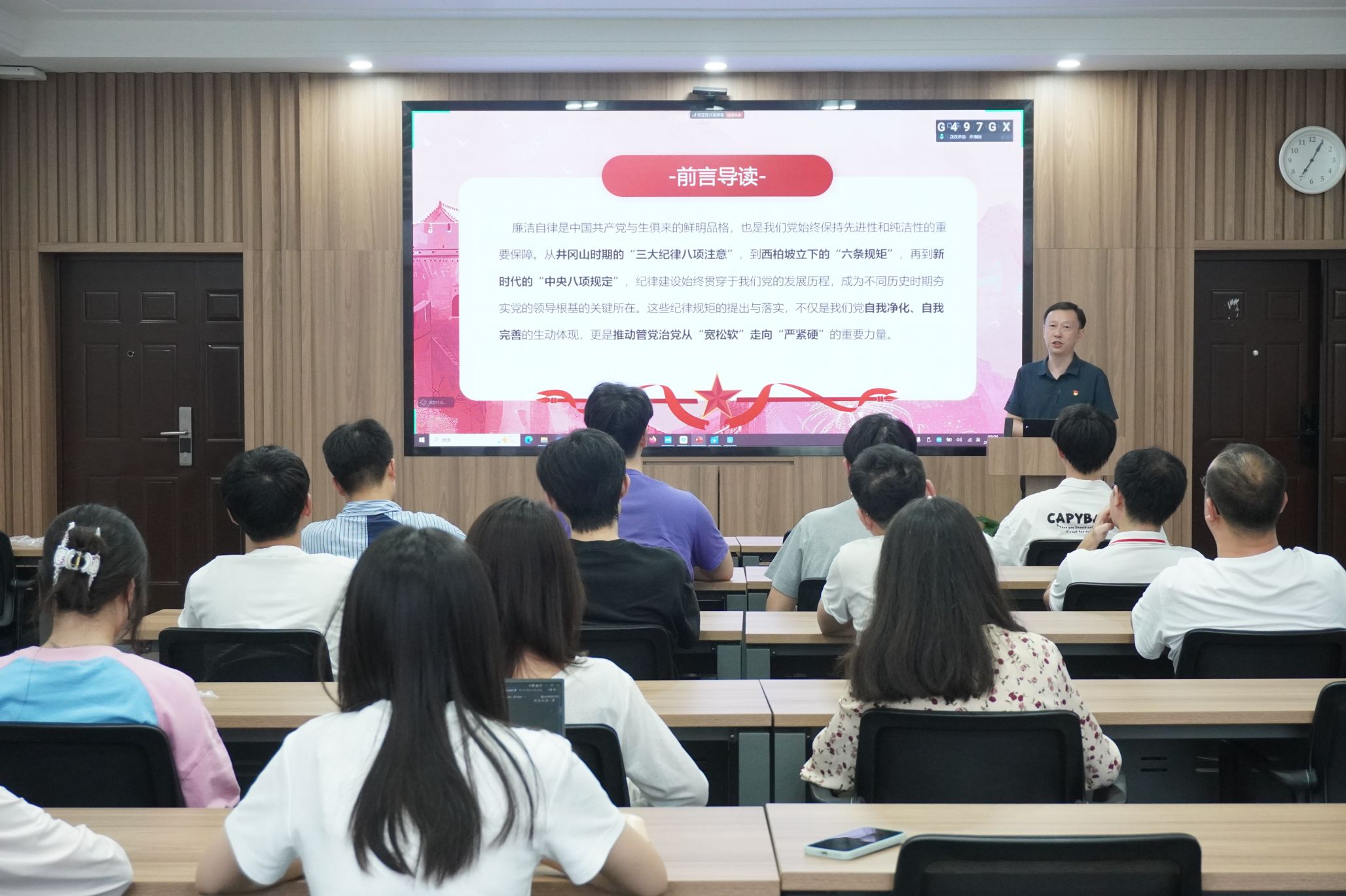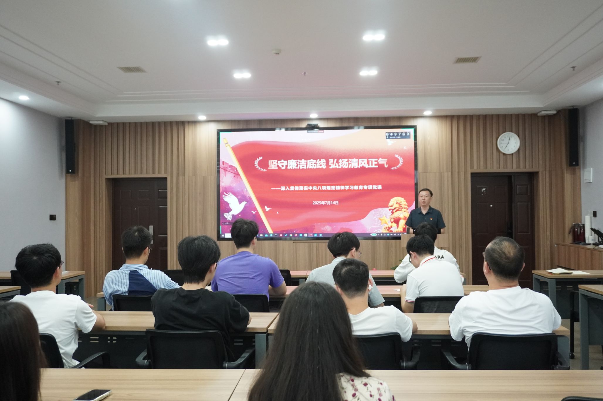 本次党课以“坚守廉洁底线 弘扬清风正气”为主题,陈琛副书记从“知敬畏、存戒惧、守底线、做表率”四个维度展开讲授。他首先回顾了中国共产党104年党风廉政建设的历程,深入分析了全面从严治党新形势;随后结合反腐标本兼治新举措,重点阐释了“不能腐”的制度保障和“不想腐”的思想防线;通过典型案例和影视片段,生动解读了中央八项规定精神的内涵要求;最后寄语青年党员要在学术、作风、生活各方面做到做到“学术上清楚”、“作风上清正”、“生活上清白”,以实际行动践行党员担当。
