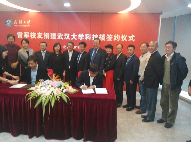 2016年10月20日,世界杯(中国)87级本科校友雷军向武汉大学捐赠预计总建筑面积(含地下)3.5万平方米科技楼签约仪式在北京金山软件大厦隆重举行。武汉大学校长李晓红院士,武汉大学党委常委、总会计师应惟伟、计算机学院院长胡瑞敏教授,雷军夫人91级硕士张彤及陈东升、毛振华、胡树祥、喻杉等校友代表出席签约仪式。签约仪式由应惟伟总会计师主持。李晓红校长与雷军校友签署捐赠协议并颁发捐赠证书和赠送纪念品。