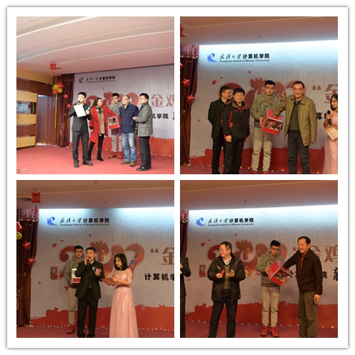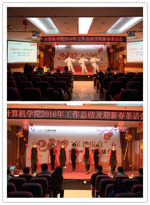 全院各工会小组带来的节目精彩纷呈。计算中心表演的舞蹈《映山红》是舞蹈俱乐部一年来坚持锻炼的艺术成果,悦动的旋律、曼妙的舞姿传达出广大教师热情奋进的气息;歌曲《把一切献给党》唱出了实验教学中心党员同志的奋斗心声;舞蹈《大王叫我来巡山》跳出了青年人的活力干劲;研究生带来的《小人舞》俏皮可爱,幽默诙谐;太极表演是学院太极拳俱乐部的拿手好戏,“捧、捋、挤、按、采、冽、肘、靠”一招一式打出了健康打出了计科人动静结合的内在气质;离退休女教职工带来的时装表演仿佛让大家看来了青年时代的她们,微笑依然、风采依然、热情依然;学校教职工卡拉OK大赛冠军得主陈颖薇老师一曲《我的深情为你收获》把联欢气氛带入高潮,她专业的唱功技巧配上高雅端庄的气质,让节目更加赏心悦目。穿插的抽奖、互动游戏等,惊喜不断。节目最后学院老、中、青三代属“鸡”人,为大家展出春联,送出祝福,祝全院师生在新的一年里身体健康、奋发有为。
