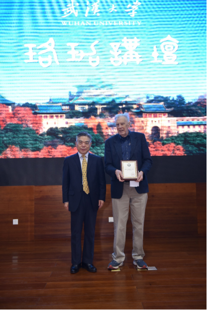 武汉大学党委常委、副校长唐其柱教授为John E .Hopcroft教授颁赠珞珈讲坛纪念牌。本科生院院长吴丹教授、人工智能研究院副院长杨志坚教授、计算机学院党委书记边金鸾、数学与统计学院党委书记左军等参加了珞珈讲坛。
