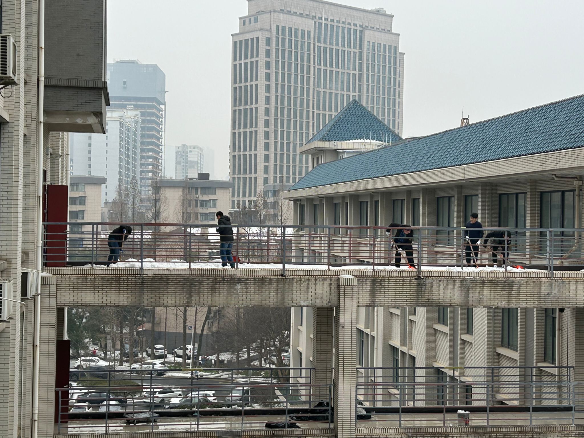 近日,受强冷空气影响,武汉市迎来最强寒潮,连续几天的降雨降雪让校园覆盖了一层厚厚的积雪,车辆行驶缓慢、行人步履蹒跚,为交通出行带来极大不便和安全隐患。为保障师生安全出行,计算机学院以“雪”为令、闻“雪”而动,迅速组织研究生志愿者清扫积雪、铲除坚冰。