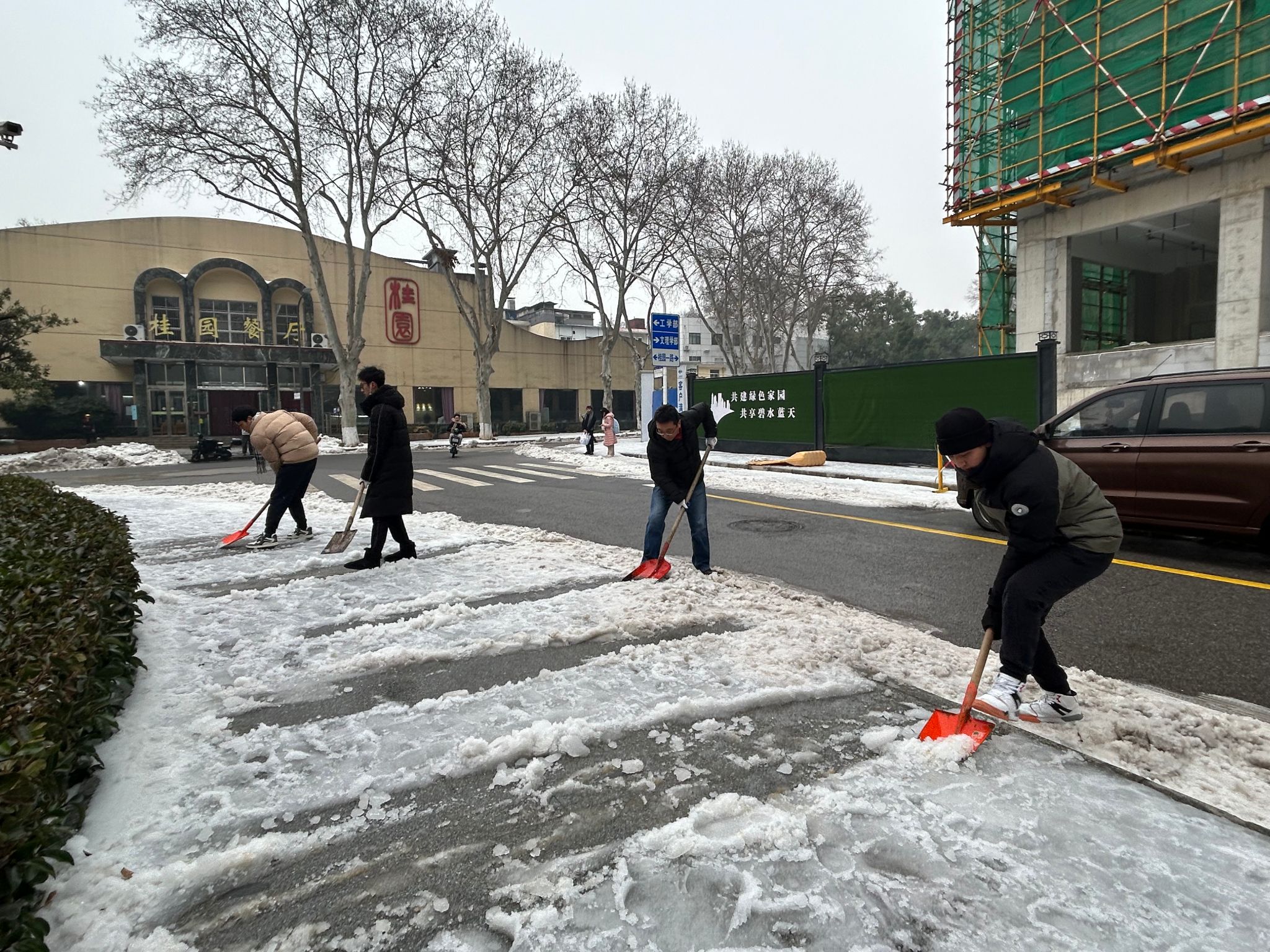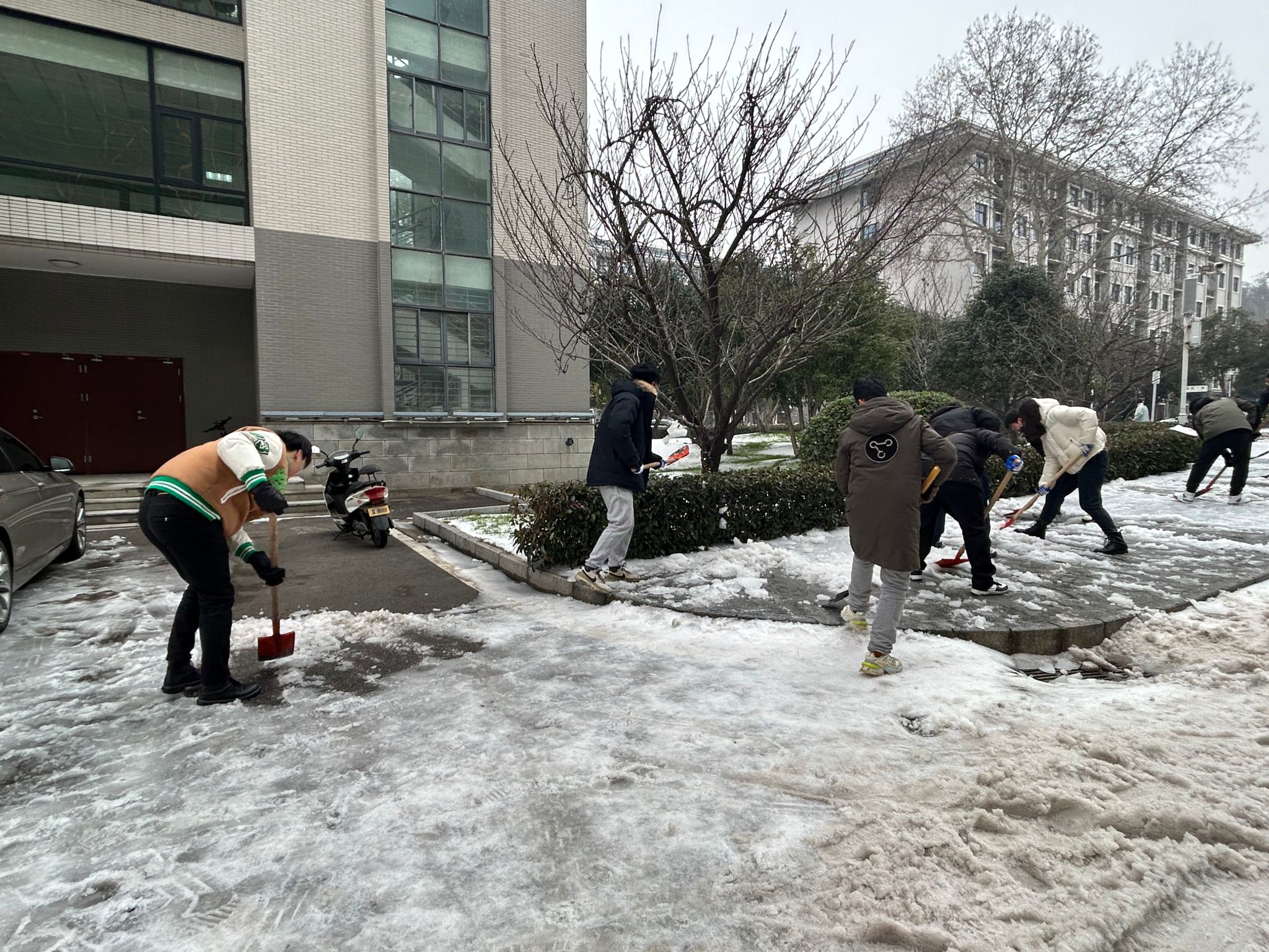 开辟通路,不畏严寒勇担当。志愿者们手握铁锹、大力挥舞,敲、推、铲、扫,铲冰层、去路障、清积雪,行动有序、密切配合,成为冬日校园里一道温暖亮丽的风景线。铁铲、扫帚与地面的摩擦声此起彼伏,既奏出了一首“铲冰除雪进行曲”,也铺筑了一条平安通行的暖心路。经过2小时的浴“雪”奋战,学院大楼区域的积雪和暗冰堆积情况得到大幅度缓解,皑皑白雪之中开辟出一条条“安全通道”。