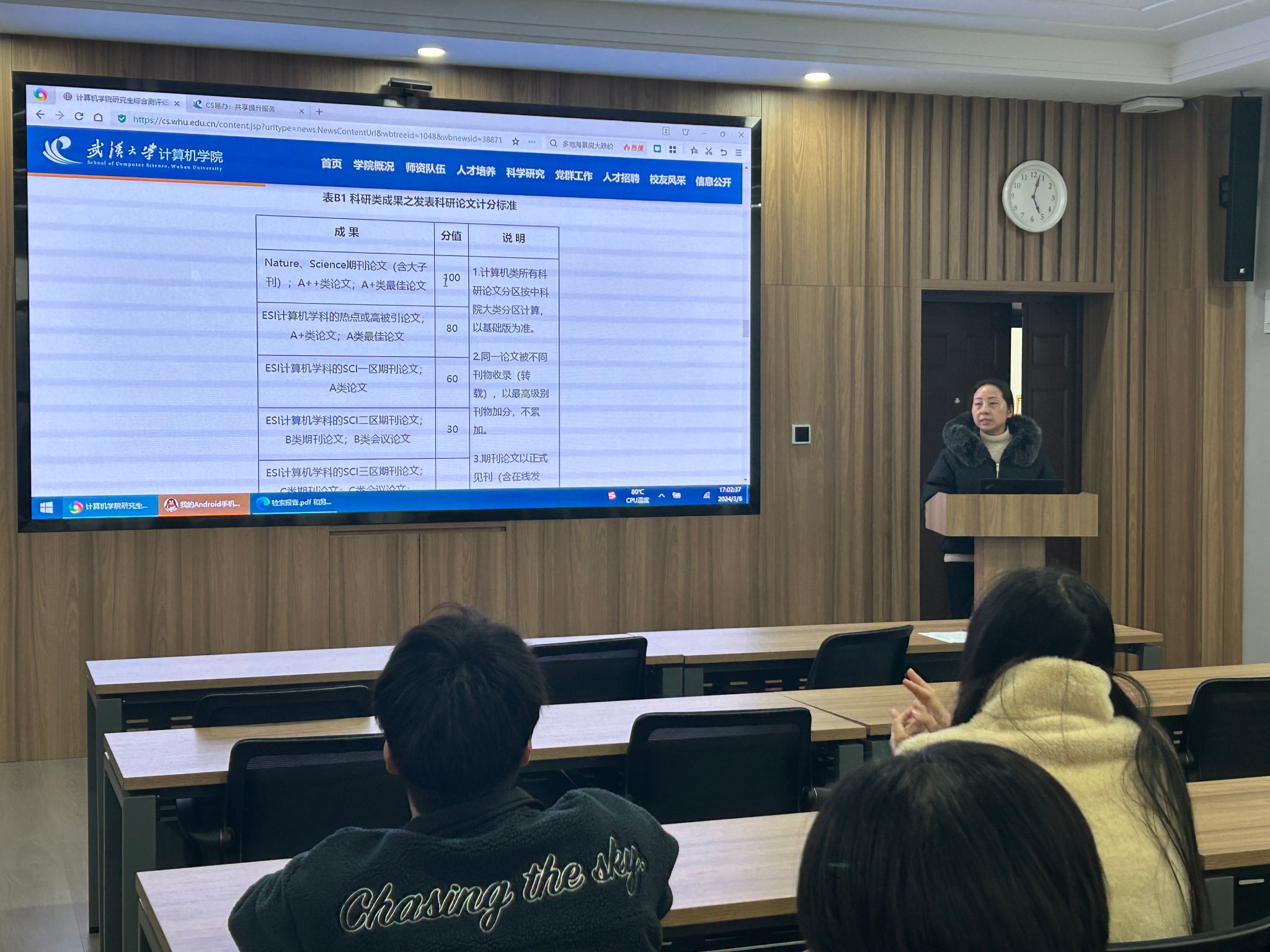 学习文件精神,提升履职能力。为规范评奖评优过程,促进研究生综合素质全面提升,学院结合研究生工作实际,出台了一系列综合测评及奖学金评定细则文件。潘艳老师介绍了制定相关制度的背景和意义,并领学了《计算机学院研究生综合测评细则(2023年12月发布)》《计算机学院研究生优秀学业奖学金实施细则(2023年12月修订)》《计算机学院研究生国家奖学金评审实施细则(2023年12月修订)》《计算机学院研究生专项奖学金评定办法(2023年12月发布)》《计算机学院优秀研究生(标兵)评选办法(2023年12月发布)》等文件内容,帮助学习委员为全面准确地依据制度规范开展班级奖学金评定工作做好准备。