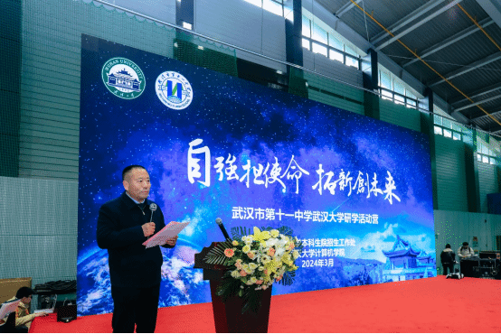 2024年3月6日,武汉大学卓尔体育馆里青春洋溢、热闹非凡。武汉市第十一中学700余名高三师生,在校长陶勇一行带领下来我校开展研学活动。武汉大学副校长周叶中教授,前沿交叉学科研究院院长周翔院士,人事部部长付磊教授,计算机学院党委书记边金鸾、院长杜博教授出席了此次活动。活动由武汉大学本科生院招生处副处长王少雄主持。