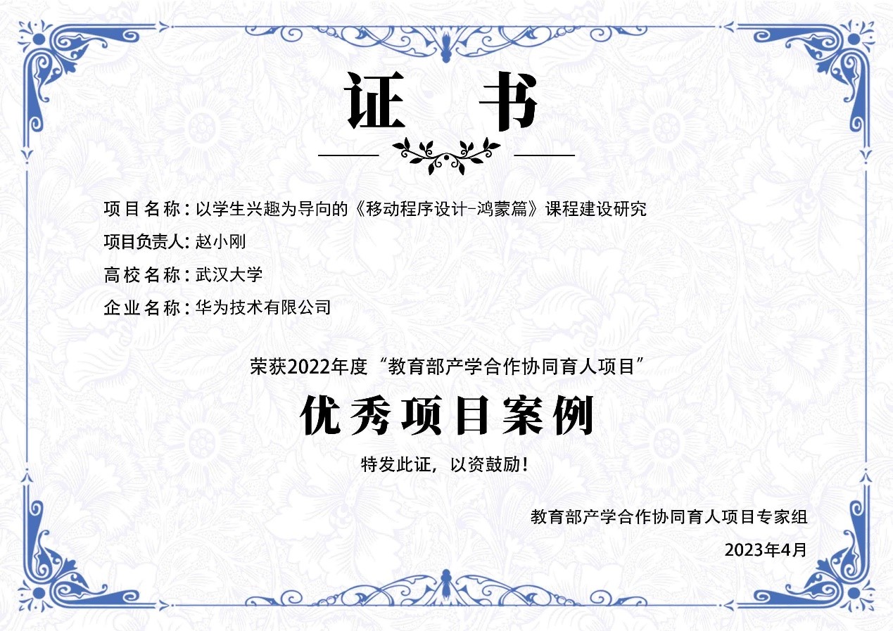 据悉,在该项目的支持下,赵小刚老师于2021年2月在武汉大学率先开设了全国高校首个鸿蒙移动应用开发课程,得到了人民日报、新华社、中国科学报等媒体的广泛报道,引起了社会各界人士对国产移动操作系统的兴趣;2021年11月,在华为人才在线网站上线《鸿蒙移动应用开发》MOOC课程,两个月吸引了100所高校近6000人选修,鸿蒙人才生态效应初显;2022年10月,编写的《HarmonyOS移动应用开发》教材出版发行,完成了一体化的鸿蒙人才培养体系,目前教材已在多所学校采用。