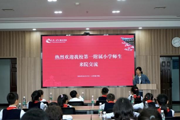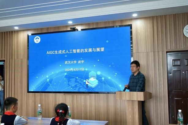 互动热身结束后,学生们来到B404教室聆听生动有趣的科普讲座。讲座伊始,杨萍书记和边金鸾书记寄予孩子们美好的祝福,期望孩子们能够开阔眼界、找到兴趣、多元尝试、创造未来。讲座中,计算机学院教授武宇用通俗易懂的语言,深入浅出地分享了生成式人工智能的发展与展望,学生们听得津津有味,不时发出惊叹和掌声。
