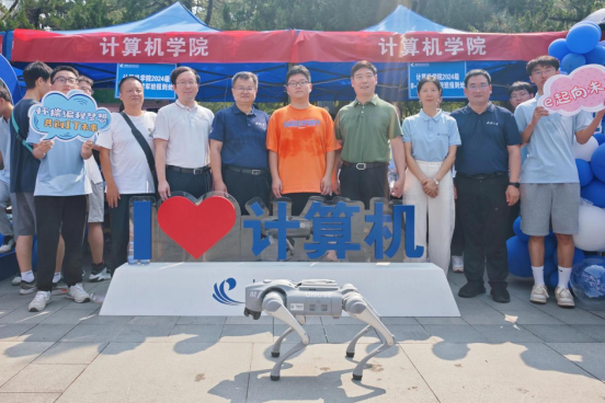 点头、跳跃的机器狗也吸引了不少目光,大家纷纷和它互动合影,人机交互操作过程更激发了新同学们对未来学习科研的期待。不少新生和家长还来到学院特别设置的合影框前打卡留念。新同学们饱含热情、活力满满,展示了2024级计科学子初入珞珈山的昂扬斗志和青春风采。