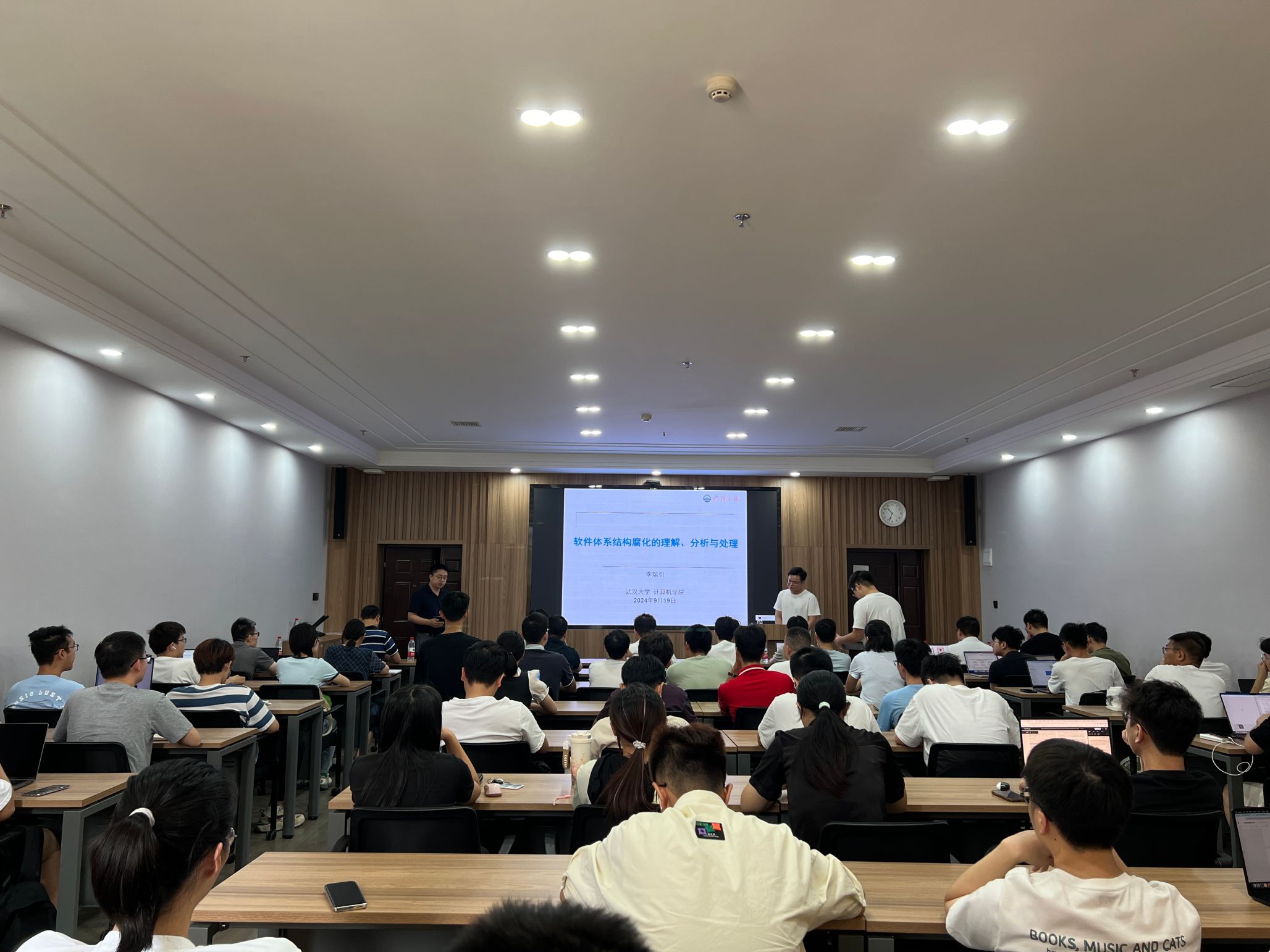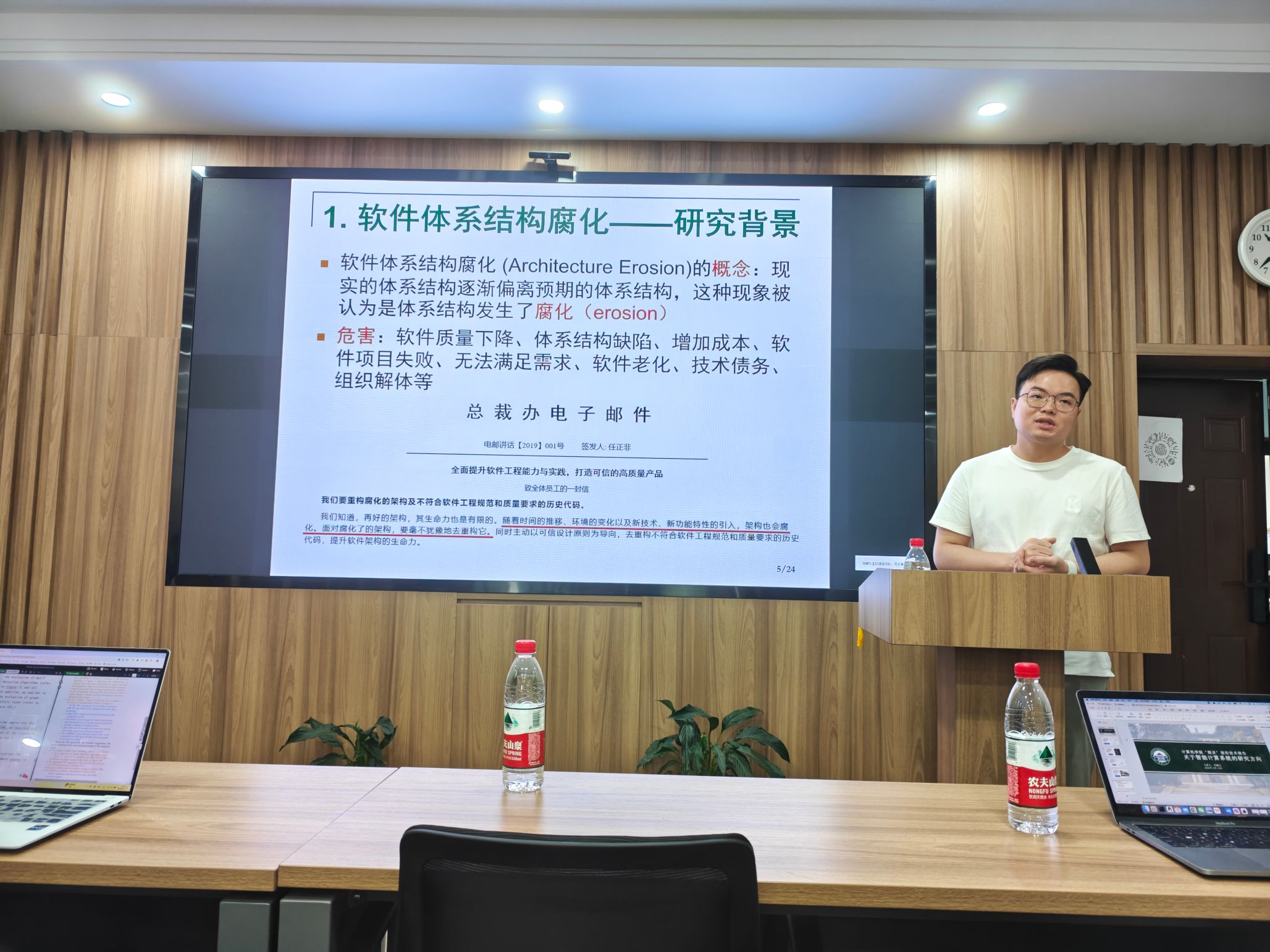第一场学术报告由计算机学院博士后李瑞引主讲,主题为“软件体系结构腐化的理解、分析与处理”。报告从经验软件工程的角度,探讨了软件体系结构腐化的诱因、后果、检测与应对方法,并介绍了利用机器学习和深度学习技术识别体系结构腐化征兆的方法,同时推荐了针对体系结构违规的代码审查的策略。