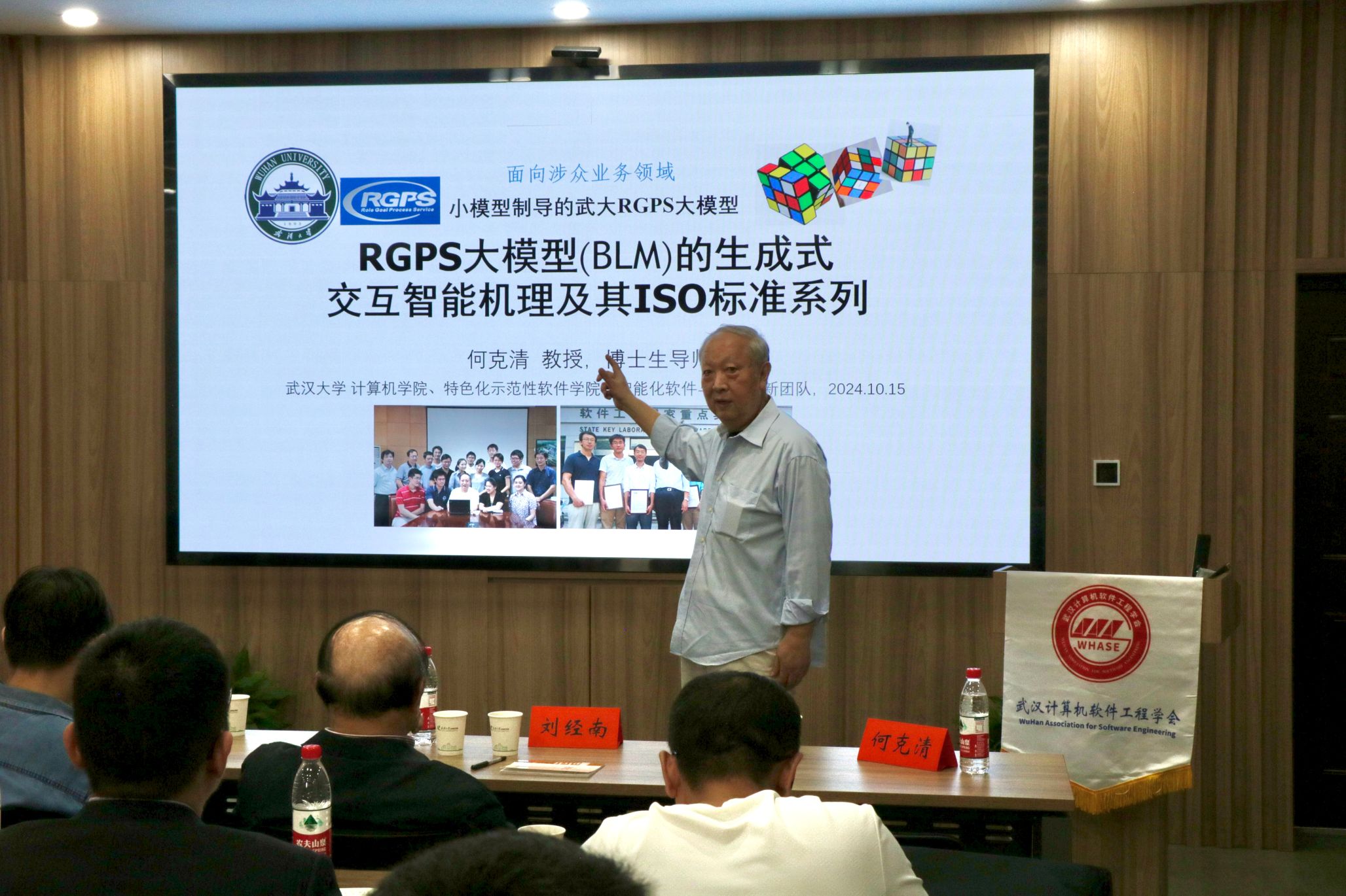 在报告中,何克清教授回顾了2006年-2009年带领团队承担的两项国家重大基础研究( 973)项目“需求工程—复杂系统的软件工程基础研究”的情况及取得的重大科研成果等,以及18年来的综合集成研究与应用沉淀,深入剖析了当前从数智到模型数智、再到大模型生成式交互智能机理解决大模型数智的难题,如何创新实现网上信息系统模型数据从存值存量、异值异构,到增值增量,唤醒涉众业务的新质生产力等挑战性难题。他详细阐明了从973项目重大成果的小模型(RGPS(R角色/G目标/P过程/S服务)需求知识元模型)到RGPS大模型及其语义标签体系,以及基于业务领域共性需求的模型规模化定制开发与训练理念,针对涉众的个性化需求及工业互联网动态接入的第三方需求,重点讲解了RGPS 大模型(BLM)的生成式AI交互机理,其中包括覆盖23种业务语言模型(BLM)交互认知的知识语义互操作性元模型(MFI)规范,及其成功主导研制的ISO/IEC标准系列国际创新成果,对RGPS大模型在推动云计算新质服务发展以及“软件工程”应对新技术突破等方面进行了展望。最后,通过多个实践落地应用案例,如“采用ISO/IEC 11179(MDR)-19763(MFI)标准融合的模型数智共享与演化”已入选某领域 2023年十大科技成果;不同而合的业务流程模型异构集成实现增值增量,如何唤醒企业新质生产力,物联网流程交互生成价值服务,具身智能机器人的RGPS大模型软件服务等,展示了 RGPS 大模型落地应用的实践案例及其广阔应用前景。何克清教授在报告会上强调,计算机软件事业是年轻人的创新事业,希望在座的青年教师和研究生在软件事业上能潜心钻研,取得良好的成绩。
