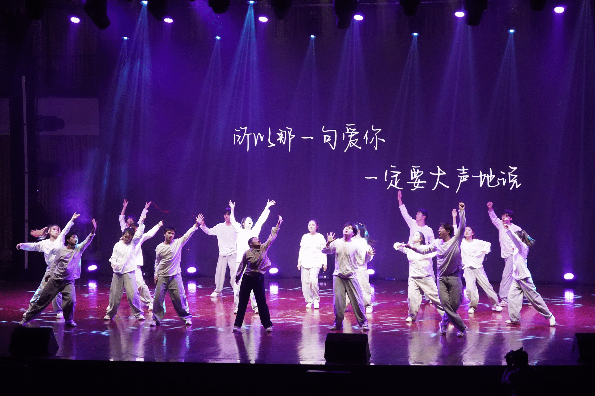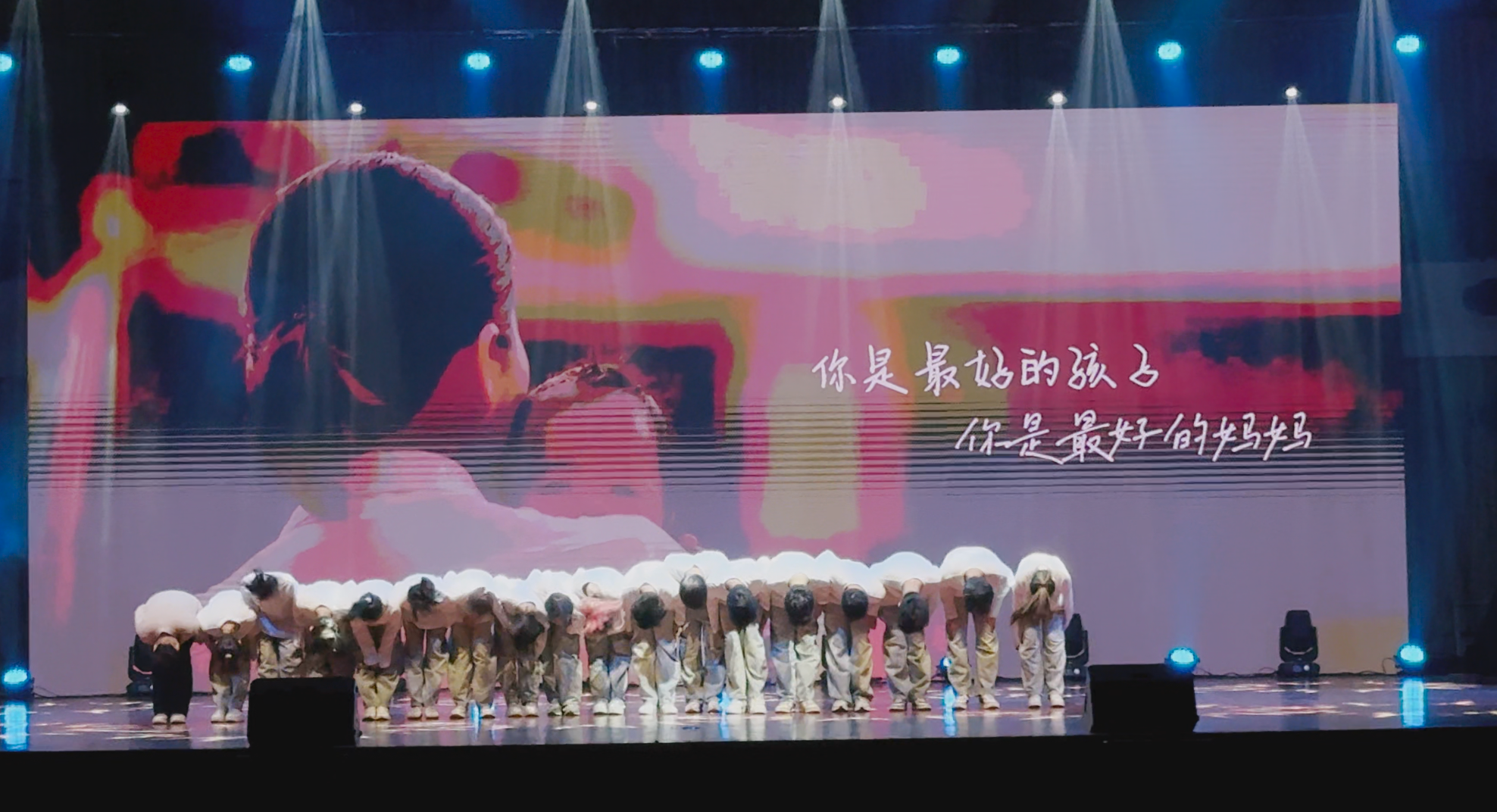 到了上台的时候,这时我们大家都已经非常熟悉了,我们的动作也打磨的很好了,这时的我们已经是一个真正的整体,所以我们已经不害怕、不紧张,因为我们知道旁边是最好的朋友,身后是最可靠的家人,心中想的是最爱的妈妈。我们的心跳是同步的,我们的眼神是坚定的。每一次转身,每一次跳跃,都是我们共同呼吸的证明。随着音乐的最后一个音符缓缓落下,我们的动作在此定格,这是我们呈现给自己和大家的最伟大的作品!