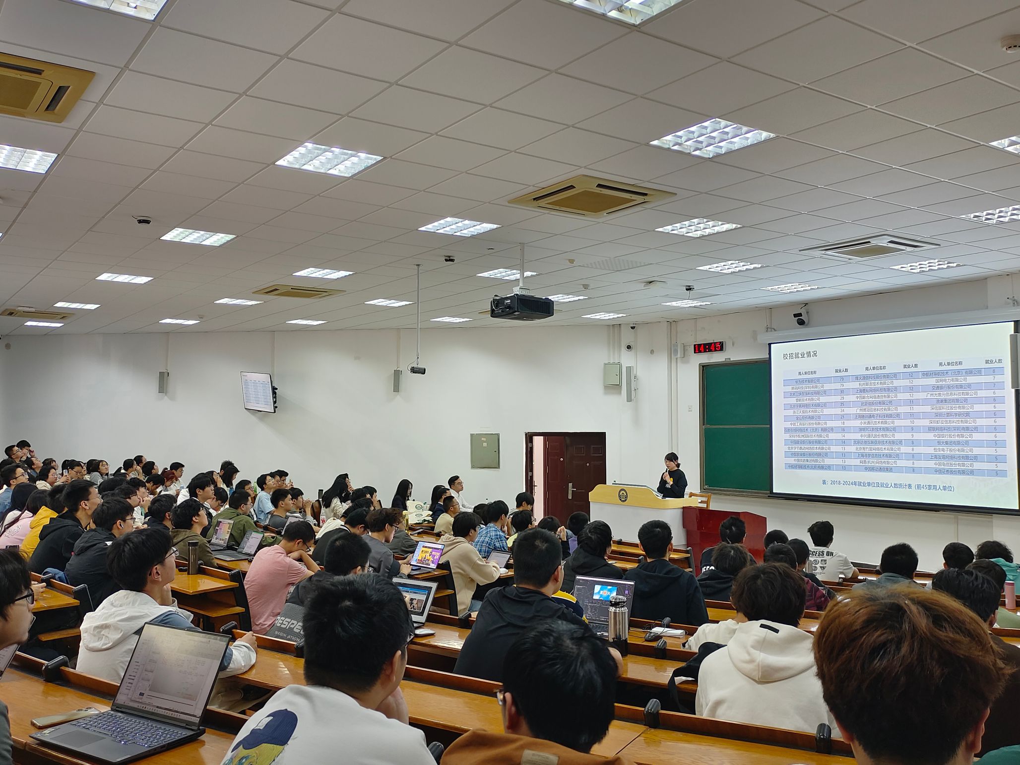 2022级和2023级年级辅导员为同学们分析了过去一学年的成绩情况,帮助大家了解自身目前的学习水平和排名状况,助力同学们在新一学年调整节奏,继续提升突破。2021级辅导员强调了大四学年的主要任务,督促同学们尽早修完学分和准备毕业论文(设计),并且讲解了毕业论文(设计)的总体流程和注意事项,为同学们顺利毕业保驾护航。同时各年级辅导员均基于2018年-2023年数据进行了毕业生去向分析,为同学们指明保研、考研、出国、就业等多种发展路径,为每种选择提供切实可行的意见。
