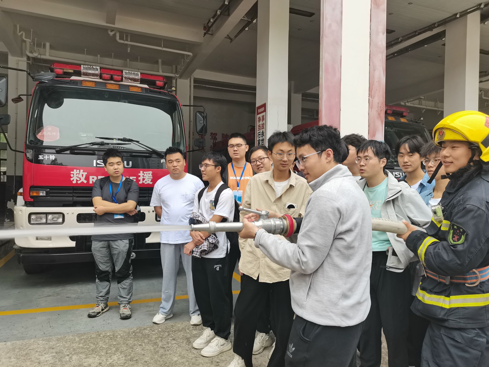 在参观学习的环节中,指导员带领同学们近距离参观了灭火车、抢险救援车、云梯车、供水车、供液车等消防抢险特种车辆,使同学们了解了不同消防车的车内设施和主要用途。接着,消防员向同学们展示了消防服的功能、穿戴顺序和携带配件,并指导同学们穿戴消防服。随后,消防战士还详细讲解了消防车随车的救援、求生、破拆、搜救等器材的基本使用方法,并邀请同学们现场操作体验。此外,同学们还参观了消防员宿舍,深入了解消防员的日常工作及业余生活,深刻感受到“火焰蓝”的奋斗姿态和时代风貌。