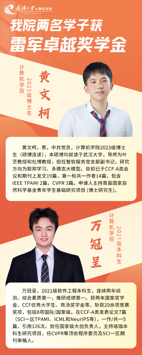 11月19日,武汉大学2023-2024学年度雷军卓越奖学金答辩会在雷军科技楼报告厅举行。经过激烈角逐,世界杯(中国)2023级人工智能系博士生黄文柯、2021级软件工程专业本科生万冠呈斩获这一殊荣。