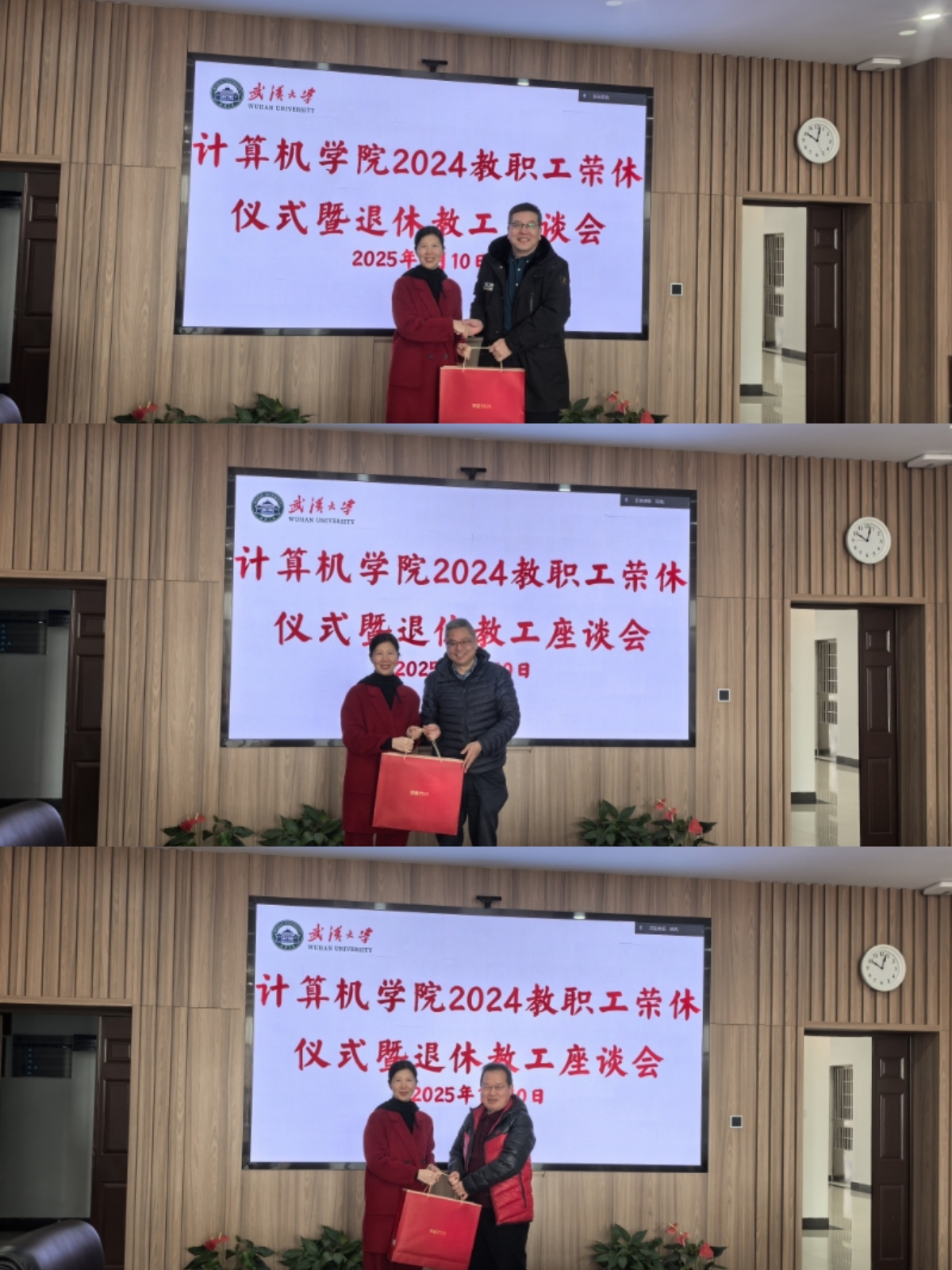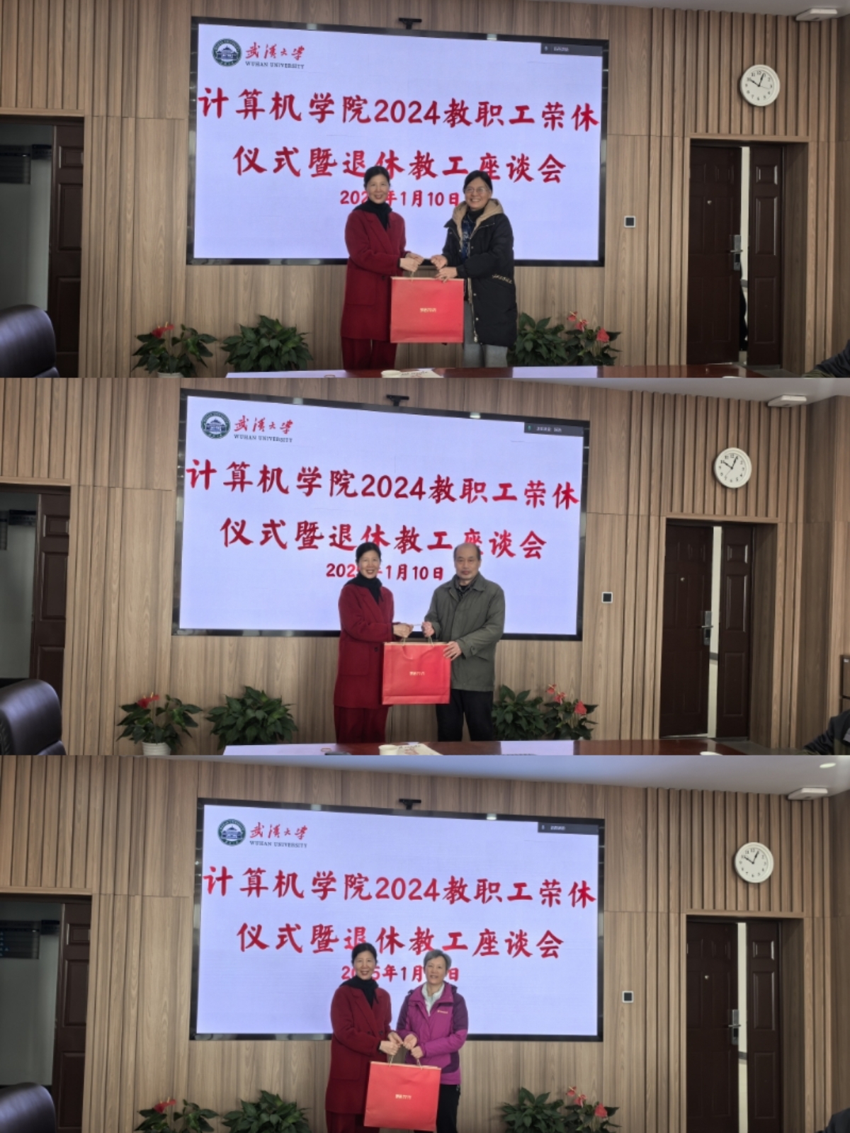 1月10日,计算机学院举行教职工荣休仪式暨退休教职工座谈会。学院党委书记边金鸾、院长杜博,2024年荣休教职工、退休教职工党支部书记、退休教职工代表以及计算机学院关工委、老协负责人何炎祥、刘春燕、熊建强等参加活动,纪委书记杨晓岚主持。