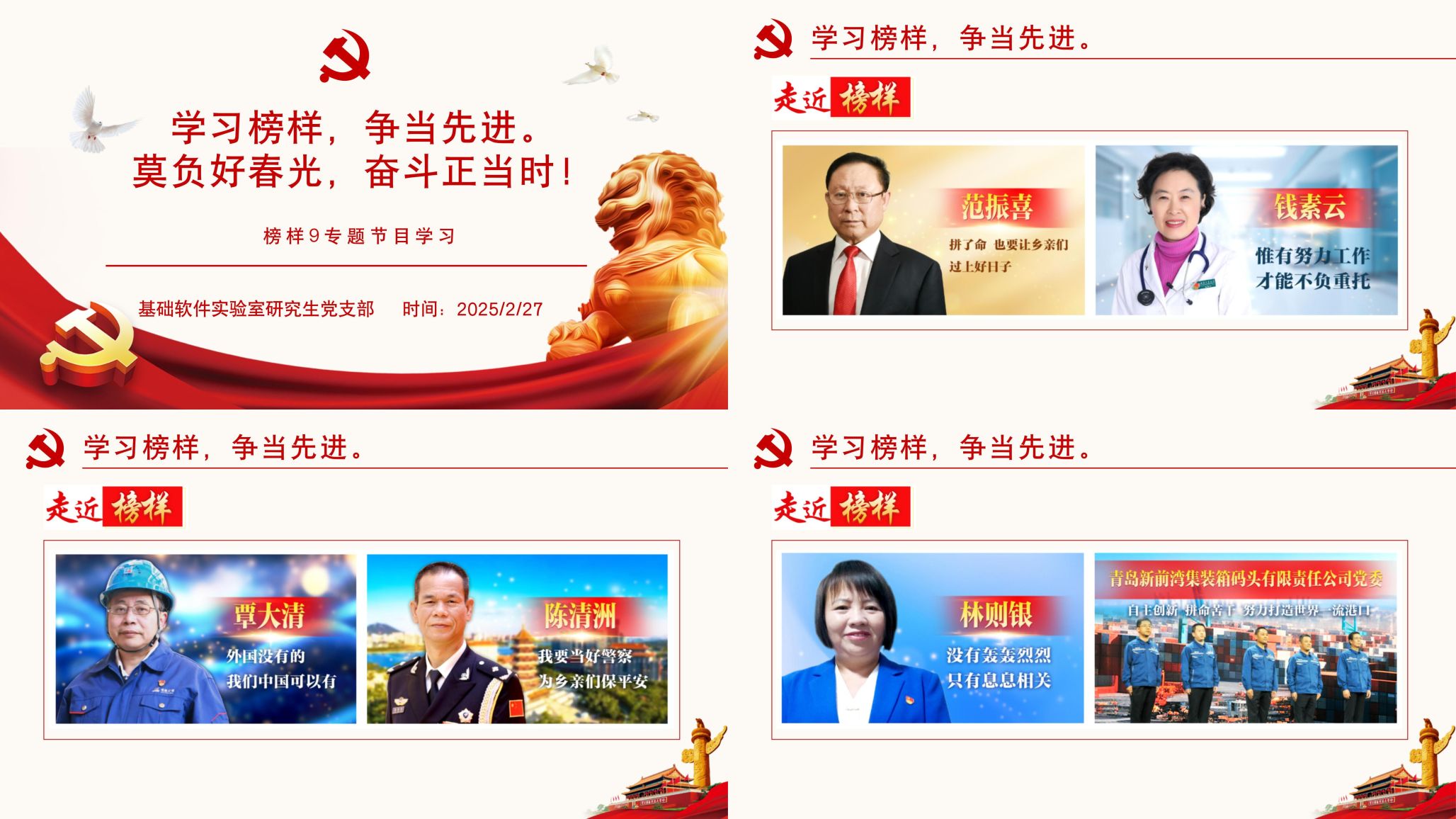 为深入学习习近平新时代中国特色社会主义思想,全面贯彻落实党的二十届三中全会精神、习近平总书记重要回信精神、学校第十次党代会精神,进一步激励广大党员传承榜样精神、勇担时代使命,基础软件实验室研究生党支部于2025年2月27日在教五开展了“学习榜样,争当先进”主题党日活动。本次活动结合《榜样9》专题栏目,通过榜样故事分享、现场交流研讨和户外踏青活动,不断强化党员党性修养,增强团队凝聚力,共同感悟榜样精神,激励奋斗担当。