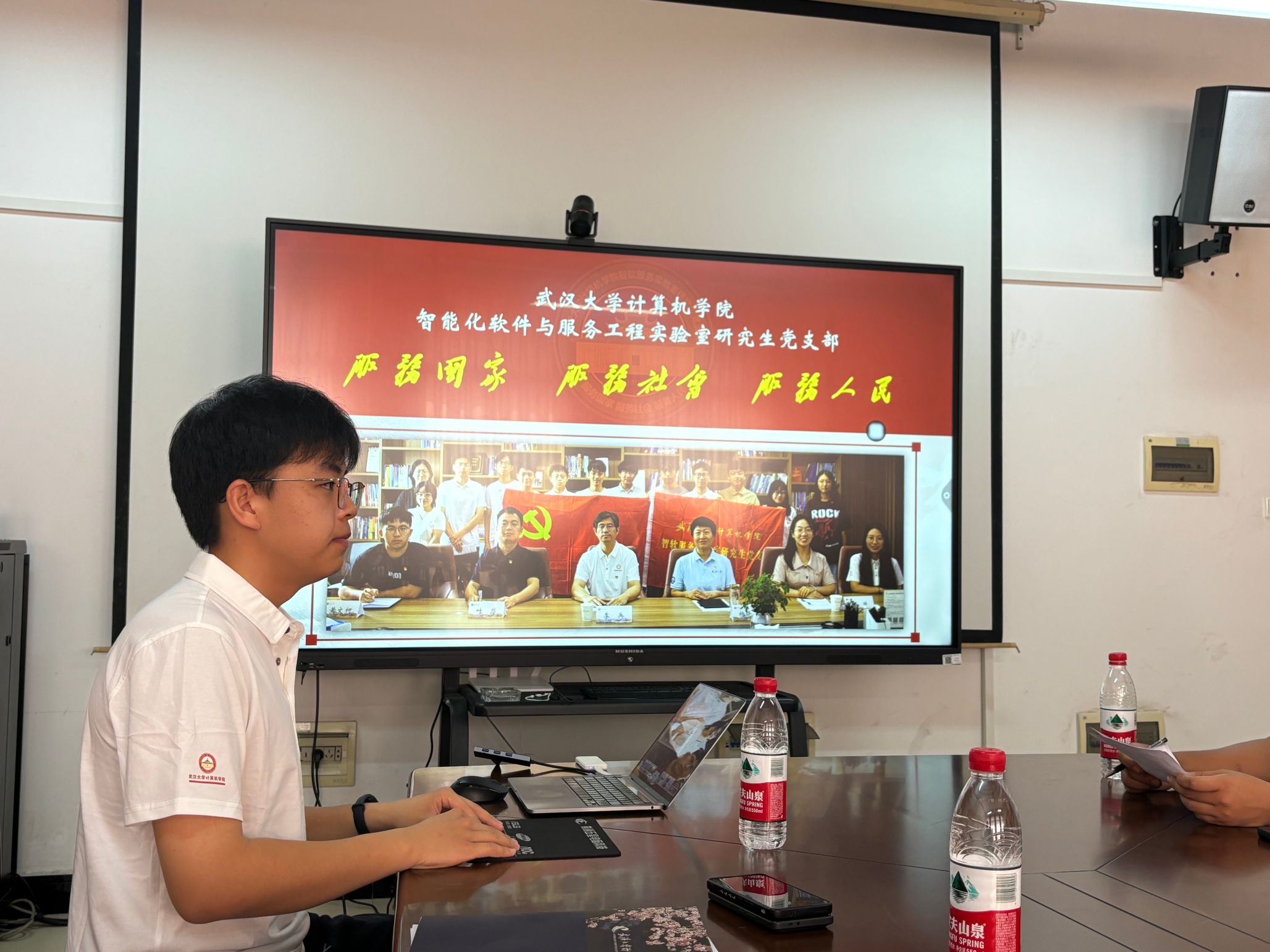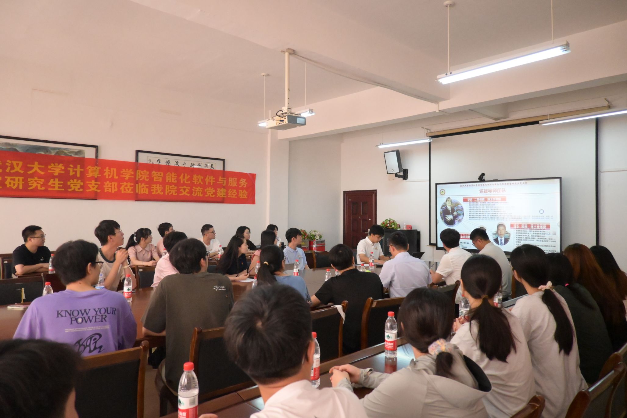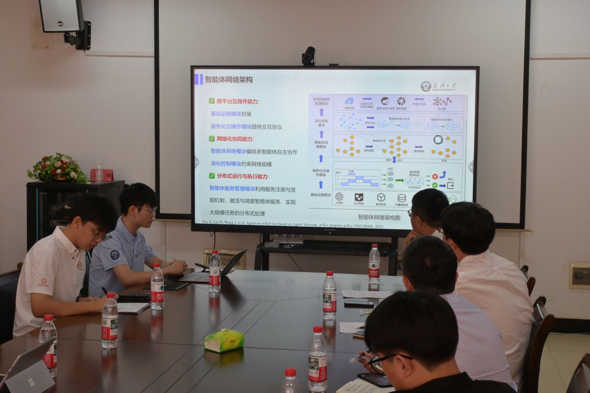支部宣传委员桑宇泽以“双螺旋式”支部建设模式创新探索与实践为主题介绍了支部以导师学生教学相长、党建科研互促共融模式下的支部建设探索与实践。“五彩先锋e站-赤诚红”学生社区功能性支部党员曾盼以一站式社区党建新实践为主题介绍以“赤诚红e站+德育、勤学橙e站+智育、嗨动绿e站+体育、艺彩紫e站+美育、实践蓝e站+劳育”为主线的“五彩先锋e站”的实施方式。支部博士生党员朱雨涵以基于智能体网络的服务化智能体研究与实践为主题汇报了在服务化智能体网络架构的研究进展与成果。随后与会人员围绕支部建设经验互鉴、党建与科研结合路径、人才培养交流展开了自由讨论。