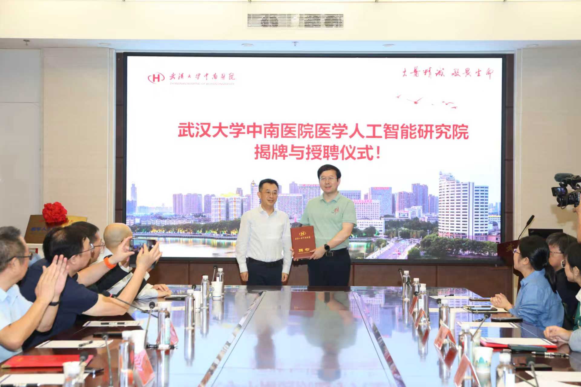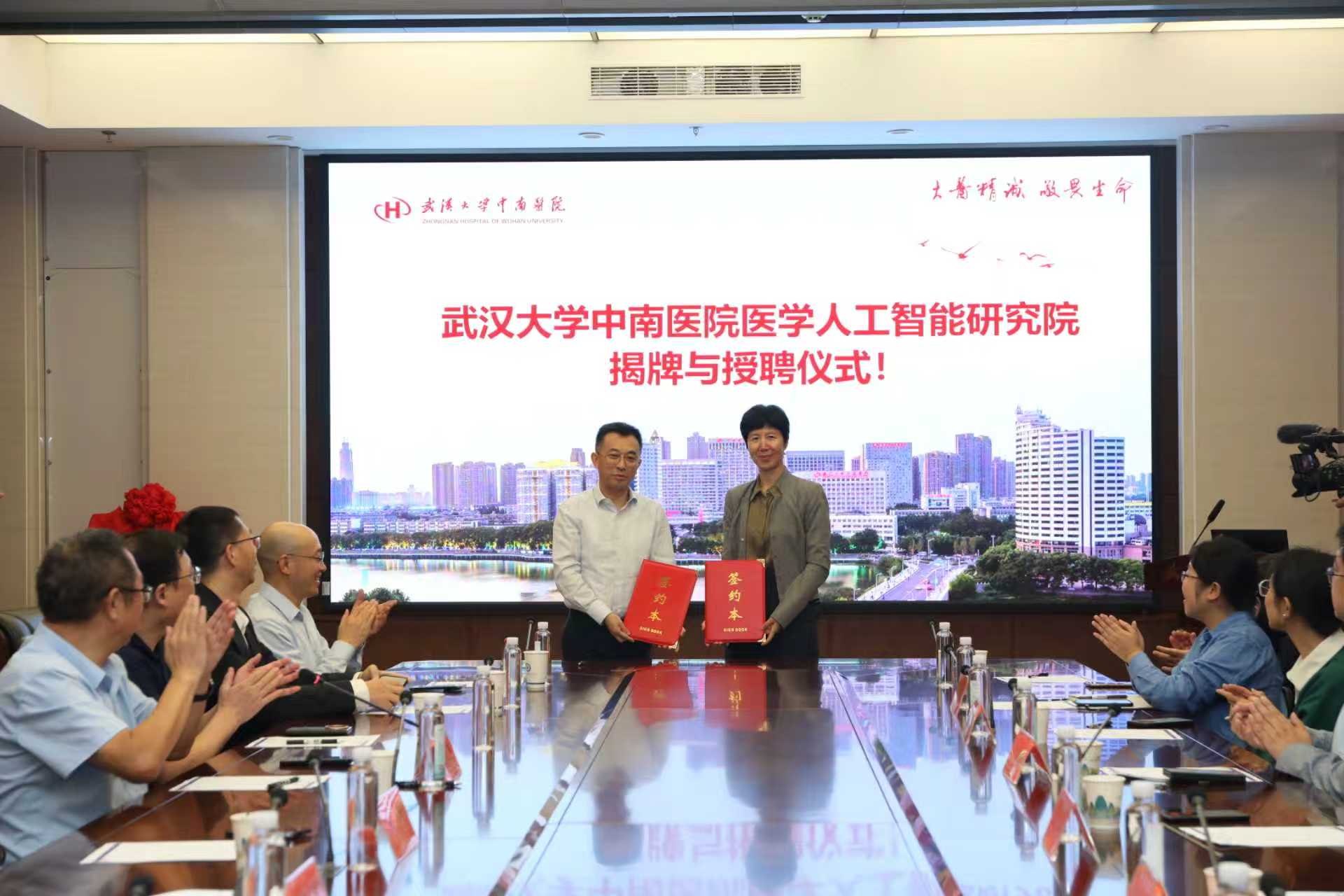 签约仪式上,刘争和边金鸾作为签约代表在合作协议上签字,并共同为医学人工智能研究院授牌。杜博被聘任为医学人工智能研究院首任院长,刘争书记为其颁发聘书。