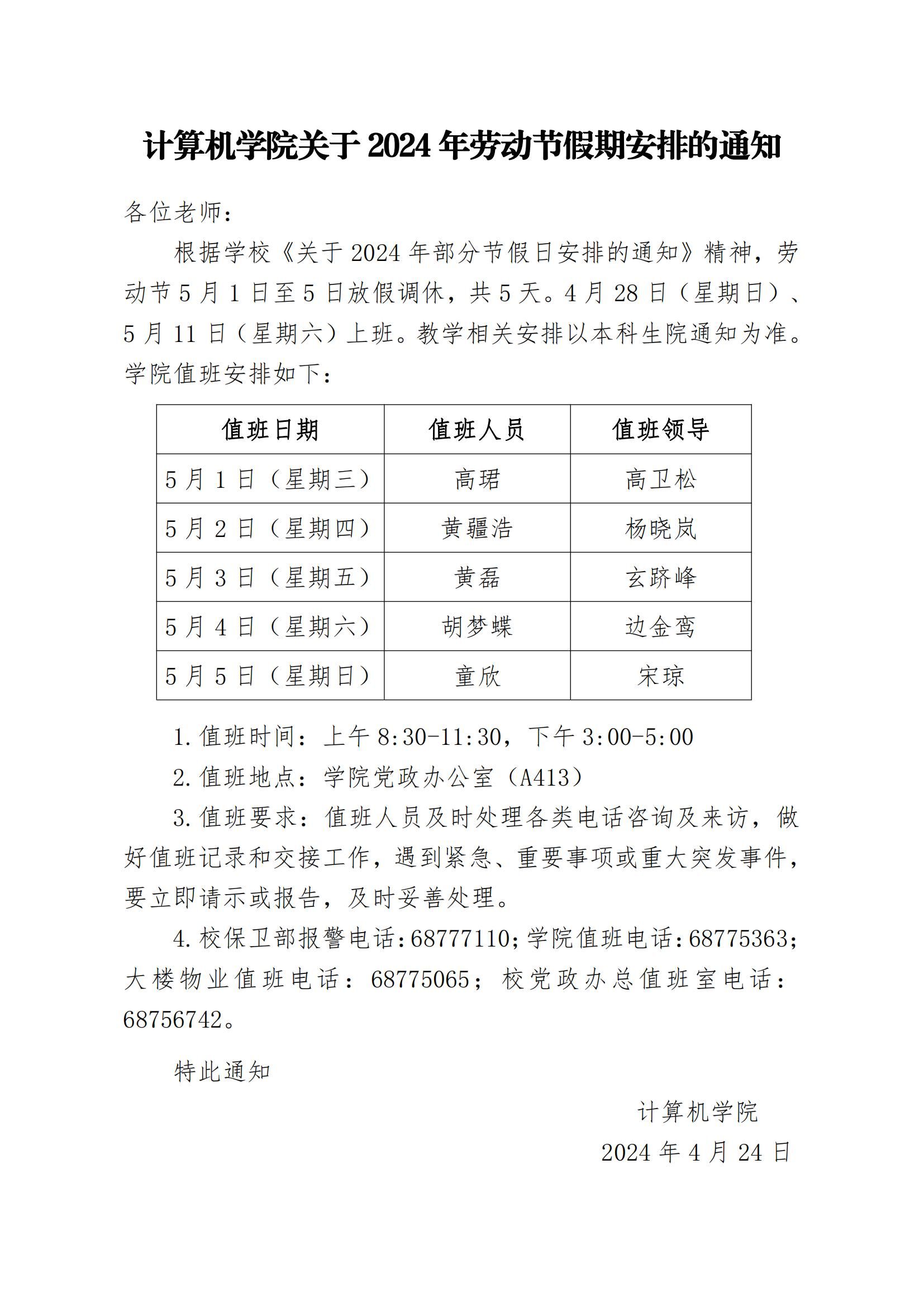 计算机学院世界杯体彩 2024 年劳动节假期安排的通知