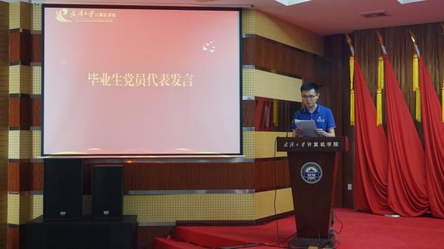 宣誓结束后,2020级硕士2班的单楚栋同学作为毕业研究生党员代表进行发言。饮其流者怀其源,学其成时念吾师——单楚栋同学首先代表全体毕业生向学院党委和各位老师表达深切感谢,感谢学院为同学们提供了形式多样的党建活动和内涵丰富的学习机会。随后,单楚栋号召各位在座的毕业生,作为新时代青年党员,理应明确自己的责任和使命,牢记老师们的殷切嘱托,将个人理想和党的事业紧密结合,始终牢记党的宗旨,坚持全心全意为人民服务;作为计科专业人才,应当充分发挥专业特长和学科优势,把所学所长用于服务国家和人民的需要,为推动信息技术的发展、推动社会进步做出积极贡献,为实现中华民族伟大复兴的中国梦奉献青春力量。
